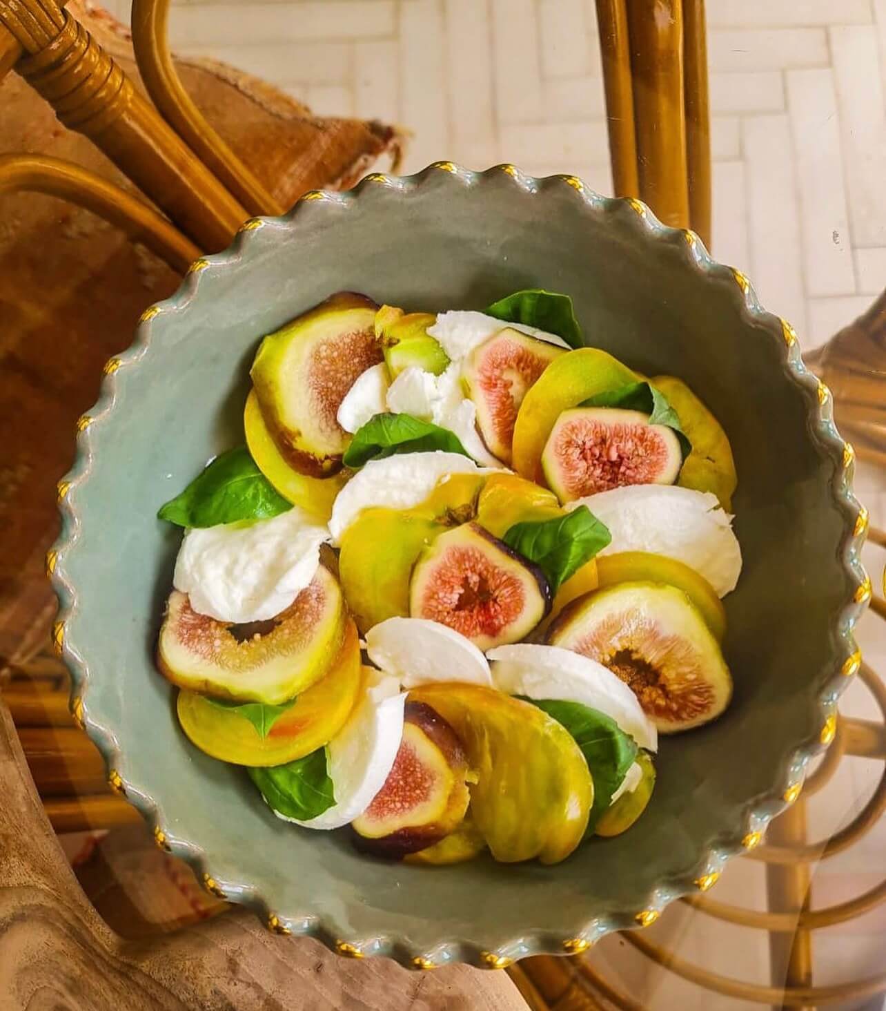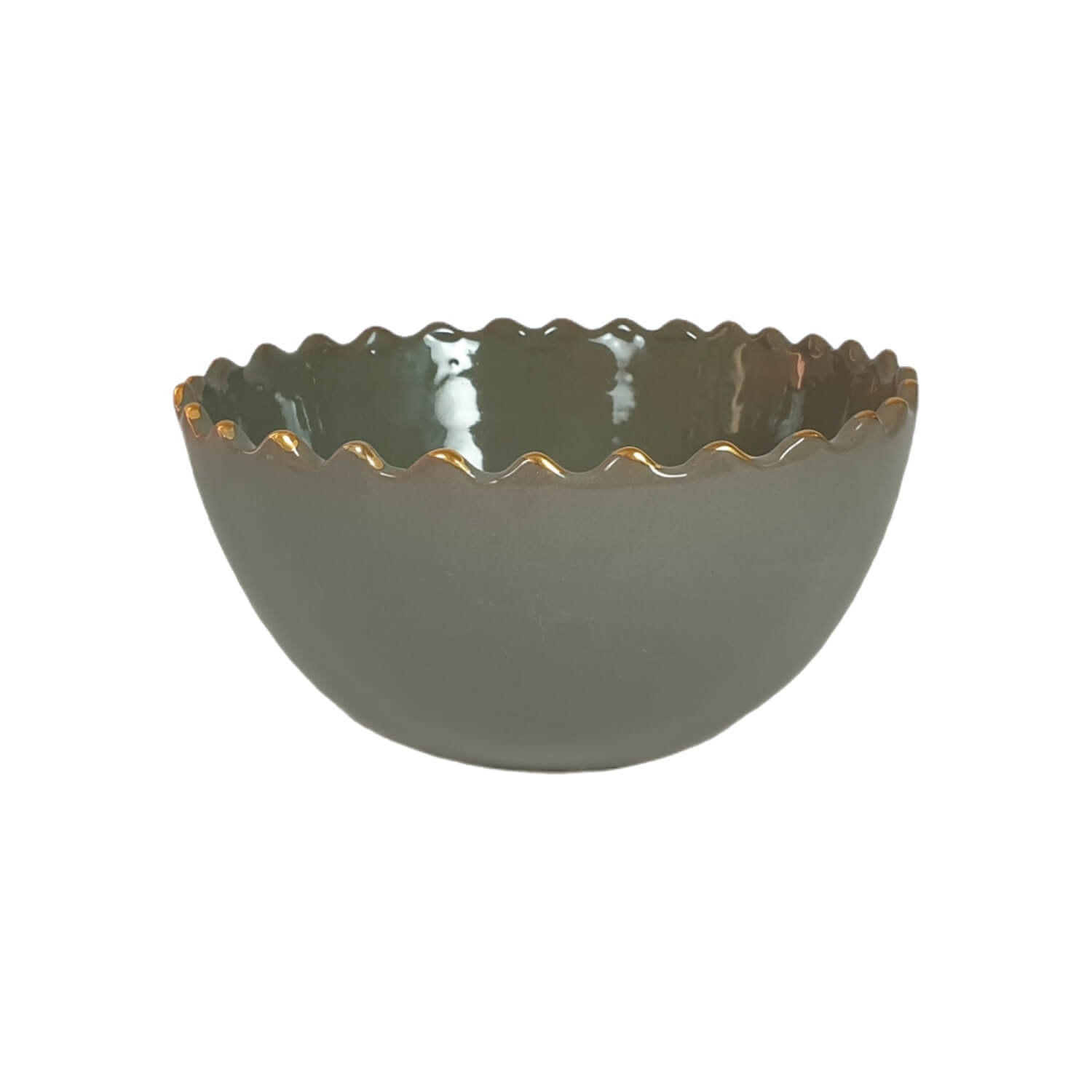 handmade green ceramic serving bowl with gold trim styled on dining table