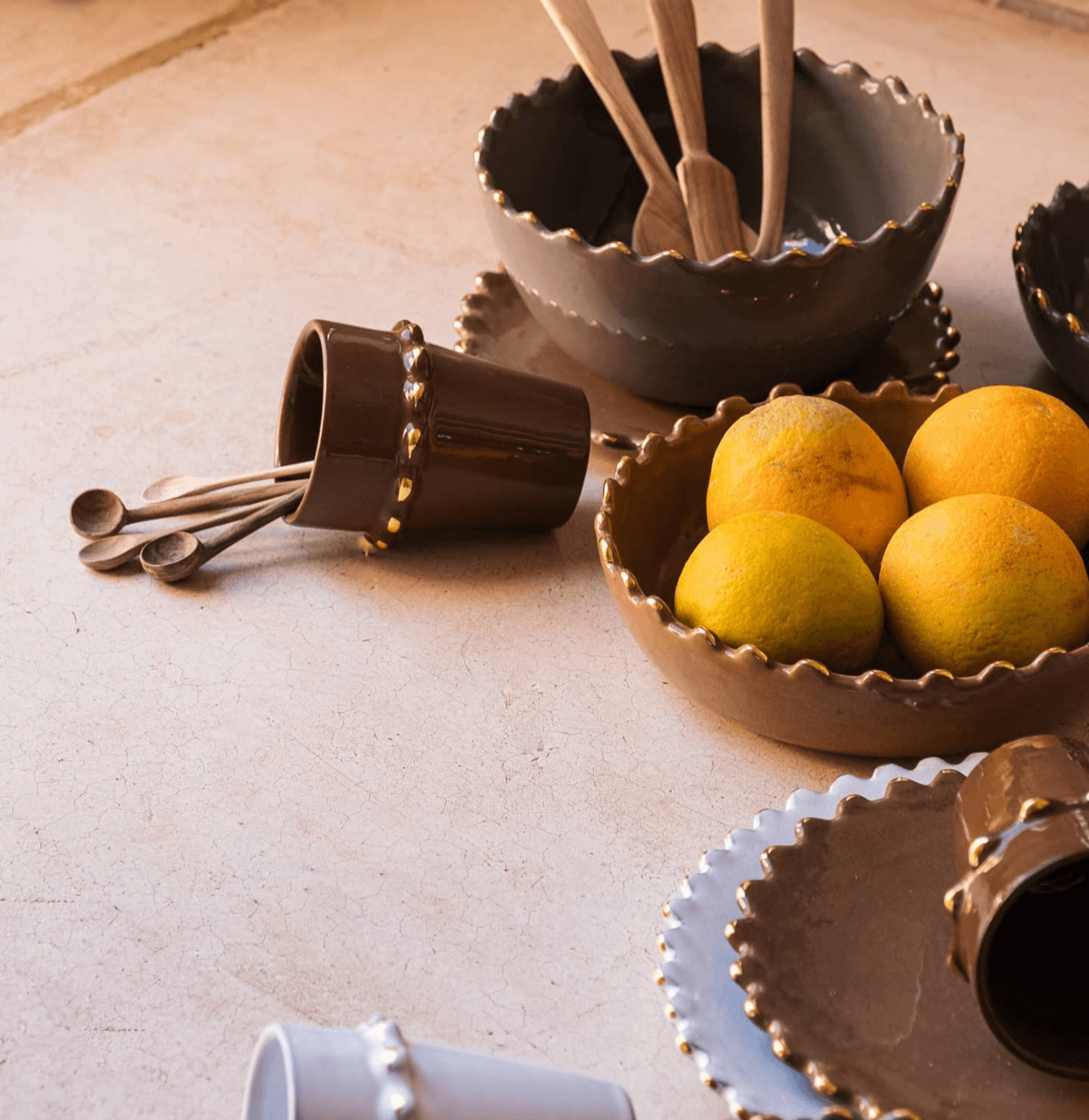 close-up of Moroccan ceramic bowl showing gold rim and artisan glaze texture